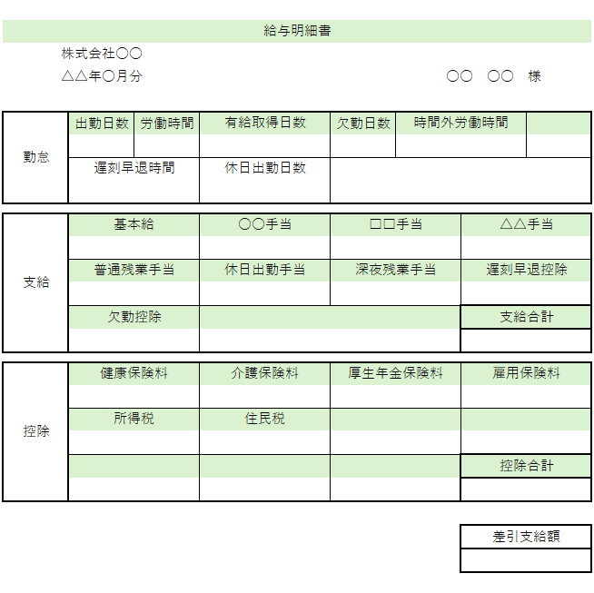 給与明細書の項目は「勤怠」「支給」「控除」と、大きく3つの項目に分けることができます。
